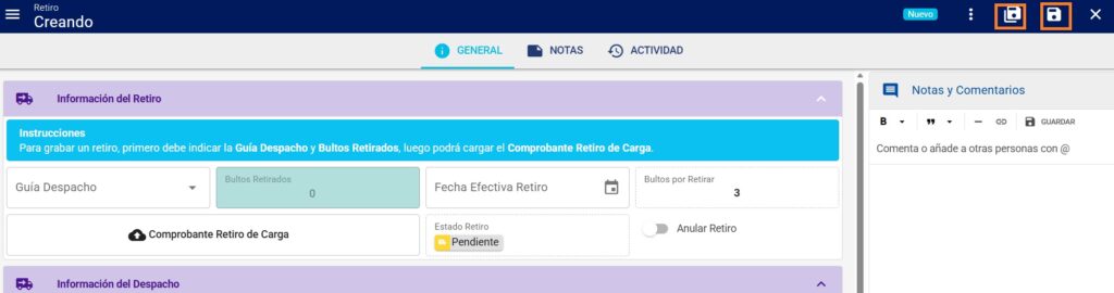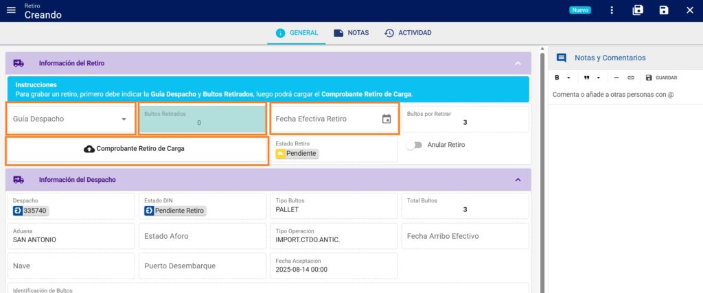 Al momento de generar el registro y retirar todos los bultos del despacho, el estado del mismo pasa a Finalizada Retiro