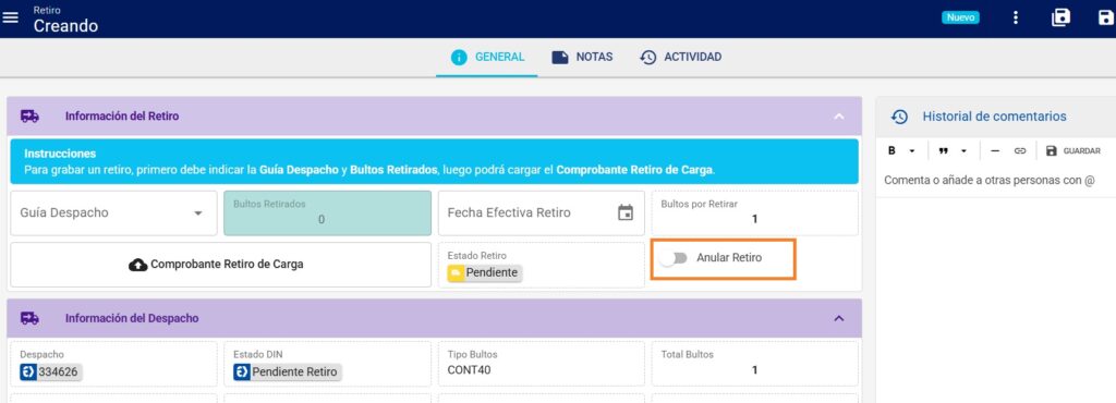 Al anular el retiro, el estado DIN del despacho cambia a Pendiente Retiro y el Estado Retiro del registro, regresa a Pendiente.